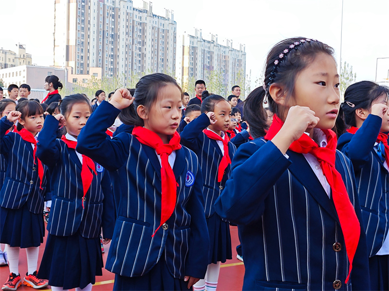 优秀少先队员代表姚易佳同学带领新队员宣誓,新队员们神采奕奕,高高地举起右拳,嘹亮的宣誓声响彻云霄。