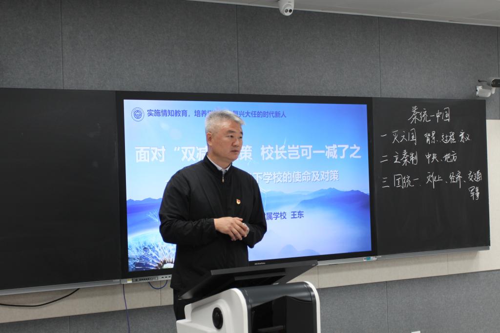 最后,王东校长就本次开放展示交流活动进行工作汇报,题为《面对双减政策,校长岂能一减了之——“双减”政策下实现优质教育之我见》。王东校长从学校层面提出十个“下功夫”,分别是转变理念、个体发展规律、学校管理、家校合作、教学过程研究、作业质量、学科活动、社团建设、心理建设、减轻教师负担。王东校长指出,学校的第一要务是工作队伍的建设,这需要教师提升个人素养,明确职业定位,这也是“双减”工作顺利开展的前提,包括对“备、教、批、辅、考”全过程的关注、作业的弹性设计和分层管理、学生心理健康教育等方面。此外,王东校长借用前总理温家宝的观点——“减负是给孩子们更多的时间接触世界,接触事物,接触生活”来说明丰富校园生活的重要性。例如,充分利用课后看护时间,构建多彩社团活动;丰富课余生活,组织研学等社会实践活动;增强学生体质,举办足球赛、运动会等体育赛事……总之标本兼治、系统施治,让有意义的教育变得有意思,让“要我学”的孩子变为“我要学”,让“双减”政策真正落地!