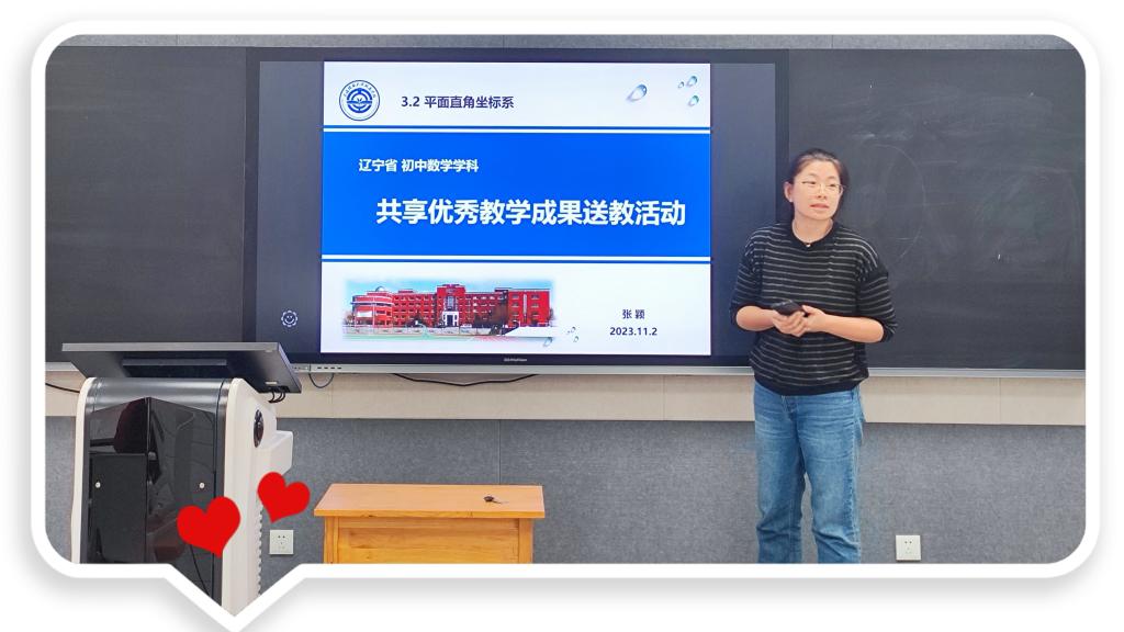 接下来,主校区初中教学发展部张颖主任展示了省级优秀教学成果送教课程《平面直角坐标系》的设计思路。张老师从课标要求、教学目标、课程课时安排分析课程内容,在大单元教学的背景下以大连理工大学校园地图作为课堂引例,让学生感受建立平面直角坐标系的必要性。最后围绕学生的座位,带学生们进行坐标定位小游戏。本课的设定直指核心素养的教学目标,渗透了单元整体的教学思想,注重现实问题情境的创设,注重探究问题的设计。
