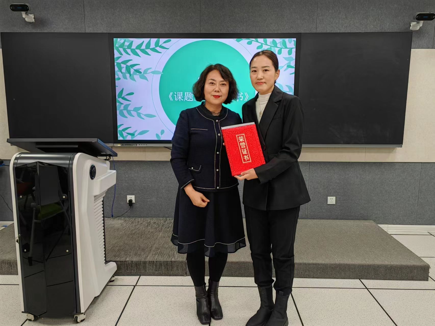 会议第一项由惠晓岩宣读《大连市教育科学“十四五”规划课题立项通知书》,并由马颖英为课题主持人张颖老师颁发《立项通知书》。