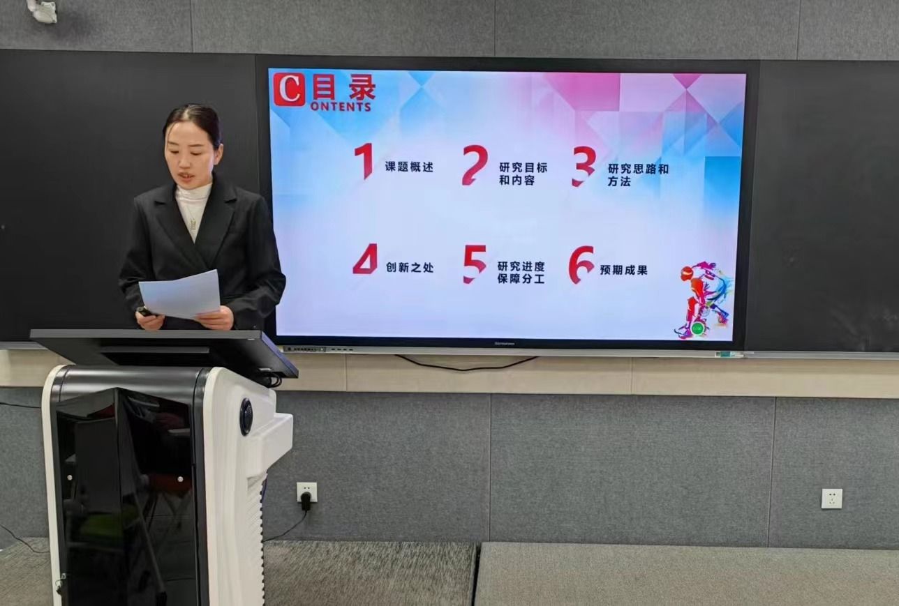 会议第二项,课题主持人张颖对《初中篮球教学评一体化作业设计与实施研究》课题做开题报告。张颖从选题的意义、概念界定、研究目标及内容、研究方法及预期成果等方面向大家做了详细的介绍。