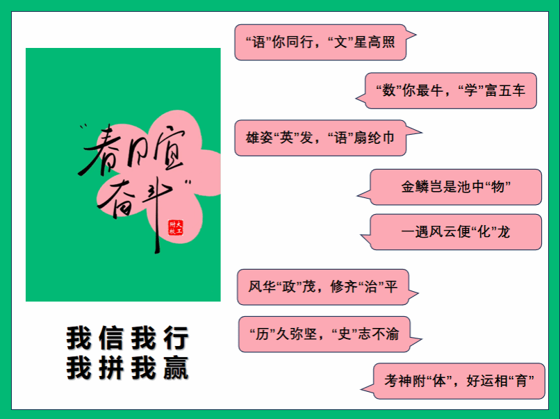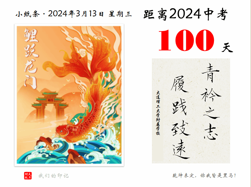 “青衿之志,履践致远”。带着老师们的祝福,3月13日九年级各班举行了仪式感满满的“百日冲刺”梦想班会。在班主任的带领下,追光少年们明确目标,坚定信念,在《梦想卡》上郑重写下“我的目标”和“奋斗格言”。在最后的100天里,同学们踔厉奋发,笃行不怠,师生同舟共进,共赴星辰大海。