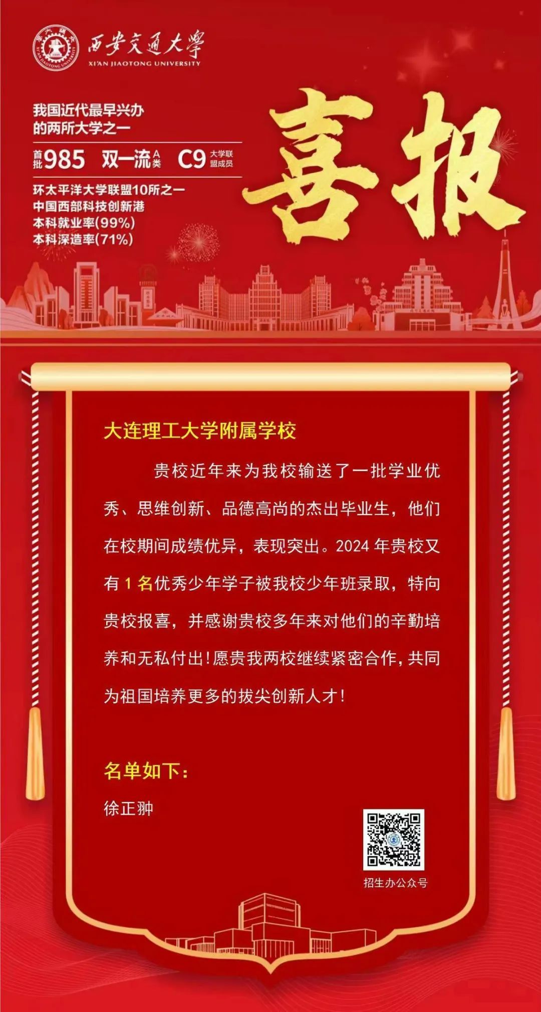在2024年西安交大少年班选拔中,我校徐正翀同学经过严格的筛选,从全国近7000 名学生中脱颖而出,顺利拿到录取通知书,接下来通过“预科-本科-硕士”贯通式培养后将直接获得硕士学位!