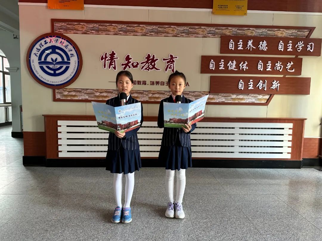 余筱芃、韩宇曦、孙悦然、周午乔、李承儒五位同学进行国旗下献词。他们首先回顾了我校“工附文明之星”等系列文明礼仪教育活动,希望通过榜样的力量,影响和鼓舞大家做一个文明的工附少年。接下来,他们用快板伴奏的形式为大家朗诵了工附文明宣言,讲解如何从身边的点滴小事入手践行文明礼仪。伴随着轻快活泼的节奏和朗朗上口的短句,文明礼仪之花扎根在每一个人工附少年的心中。