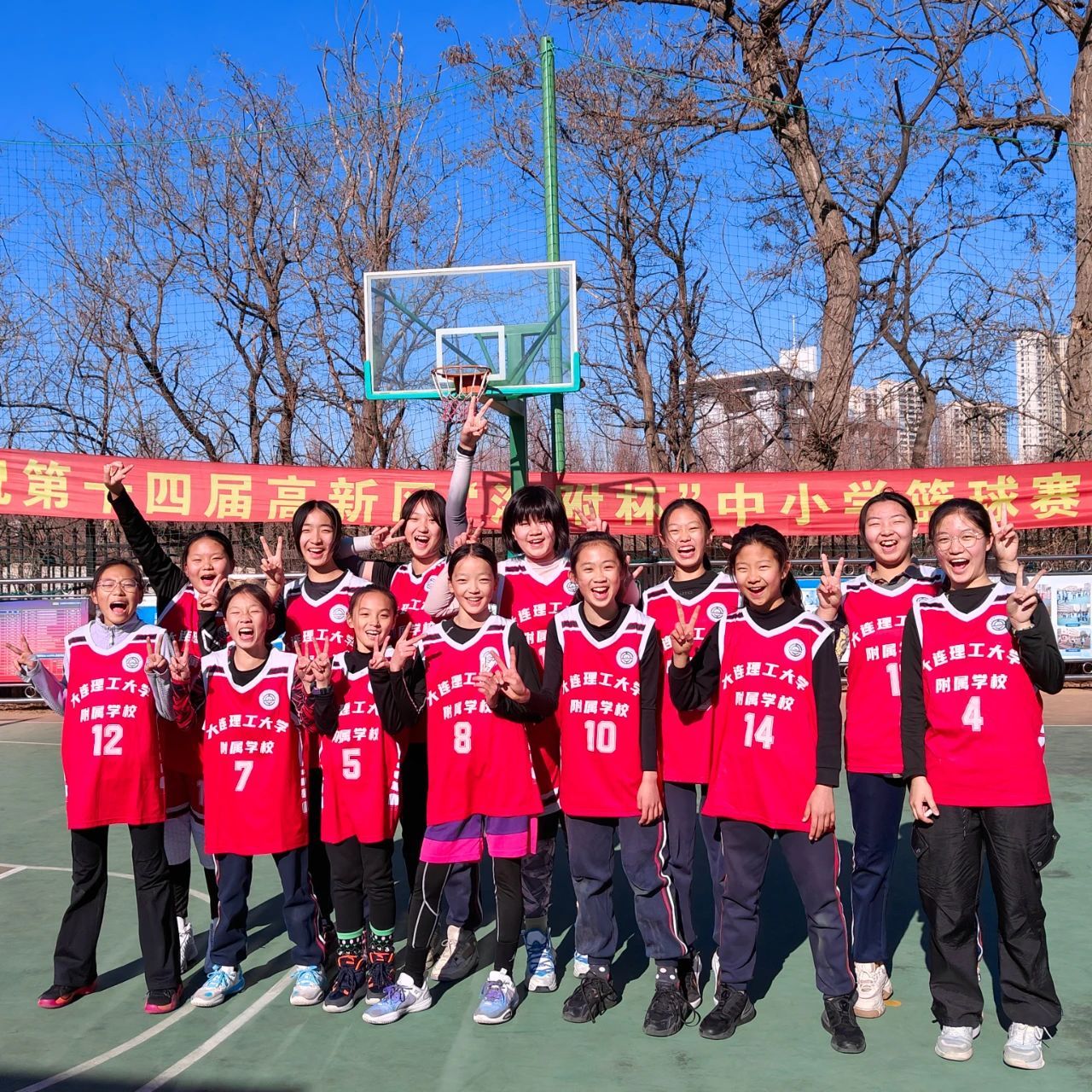 第十四届高新区“海附杯”中小学篮球赛于3月下旬拉开序幕,我校派出五、六年级同学组成的小学女子篮球队参赛。
