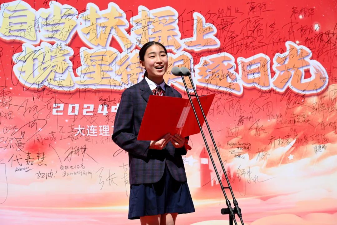 “面对困难,仰首高歌,以一颗勇敢的心,博爱的心,强大的心,永远年轻的心笑着走过。”九年一班高卓尔同学代表九年级学子表达了“你我当化鲲鹏,扶摇直上,济沧海,济天下”的坚定决心。