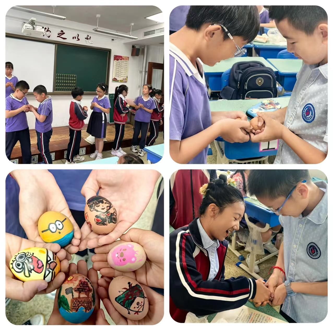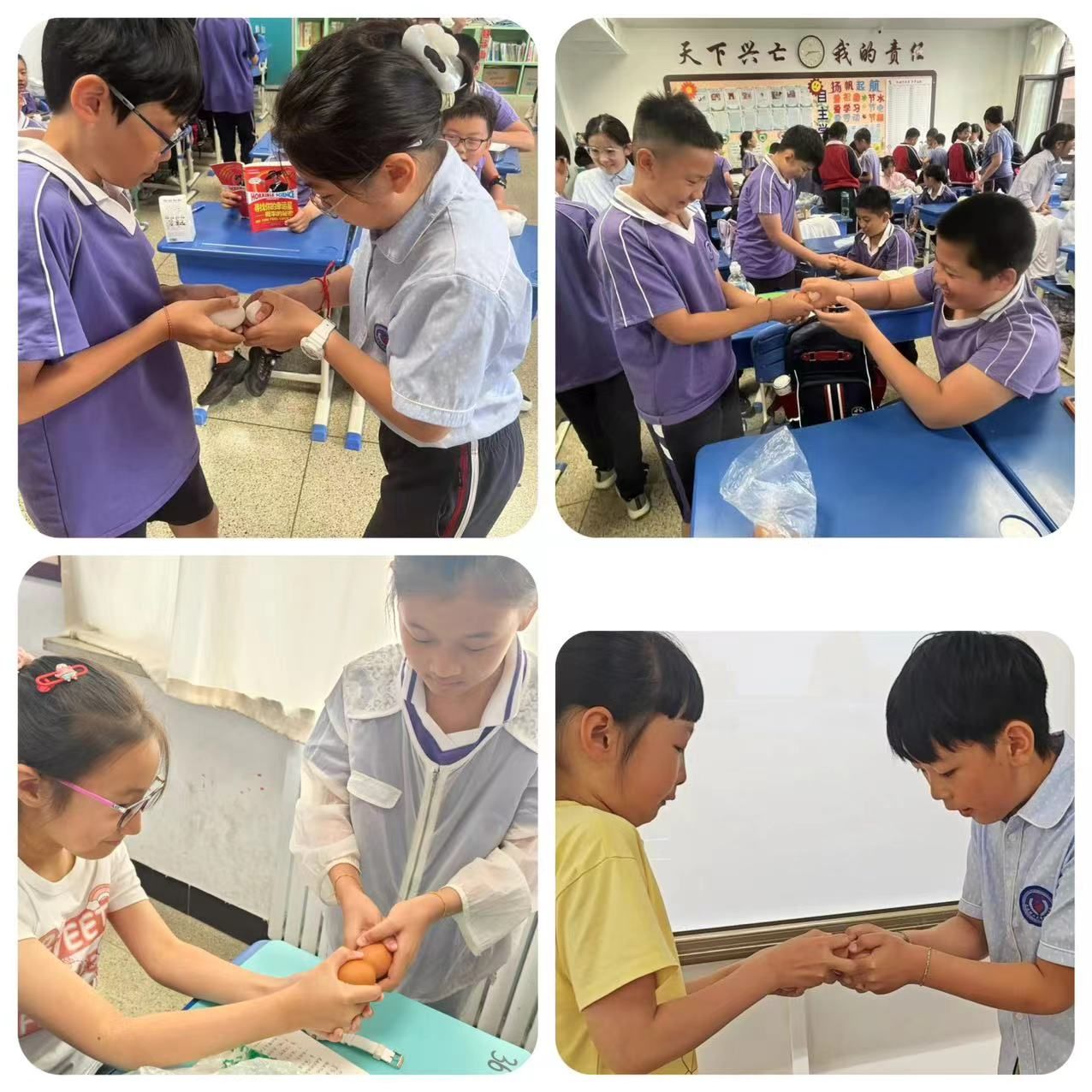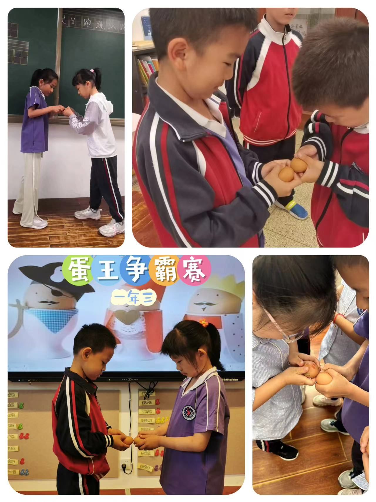 “蛋王”争霸赛是我校传统文化项目,今年我们迎来了第四届“蛋王”争霸赛活动·。比赛共分为三轮:同桌赛、小组赛和决赛,随着班主任老师一声令下,比赛正式开始,教室里立刻沸腾起来。同学们神情专注,格外兴奋,比赛进行得热火朝天。