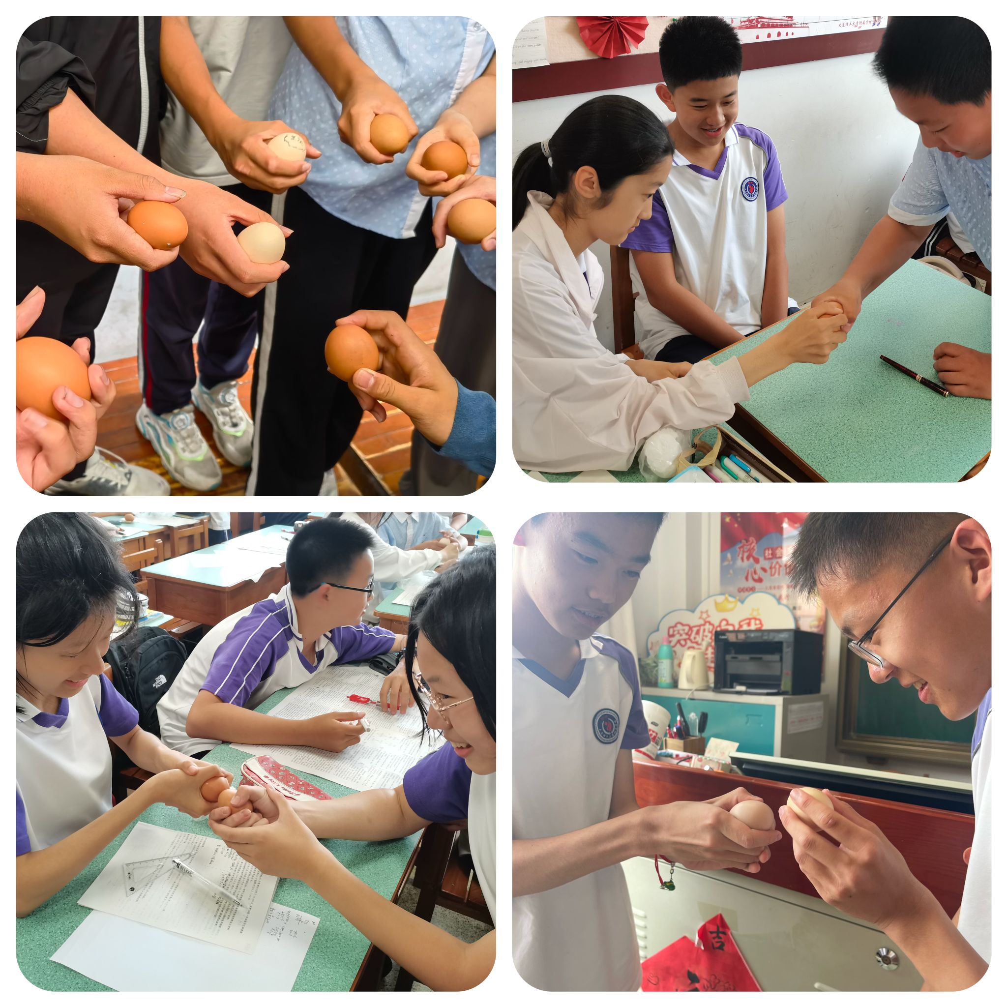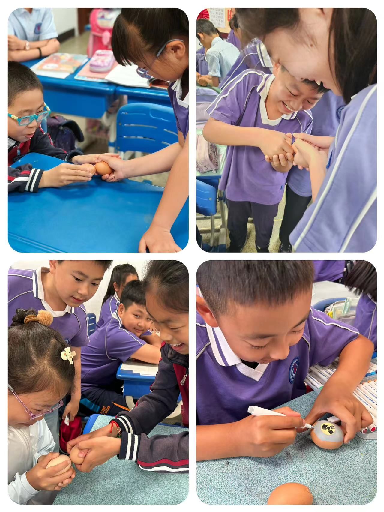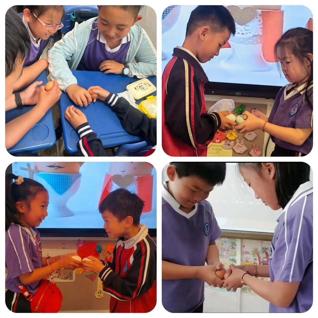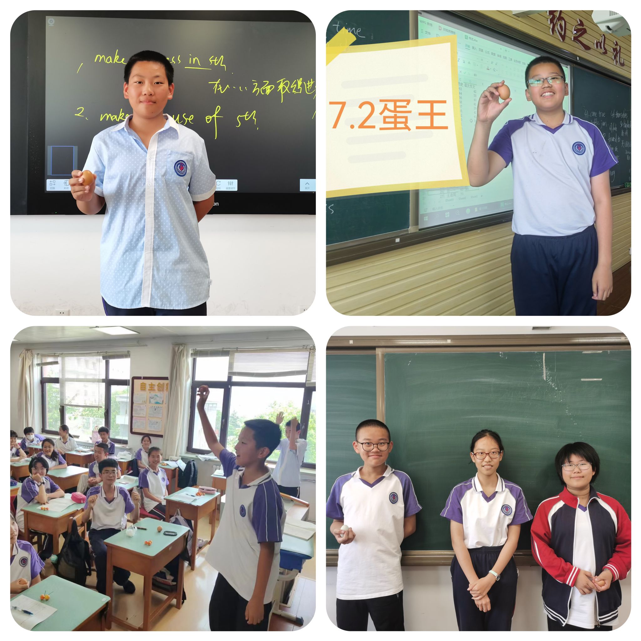“蛋王”争霸赛是我校传统文化项目,今年我们迎来了第四届“蛋王”争霸赛活动·。比赛共分为三轮:同桌赛、小组赛和决赛,随着班主任老师一声令下,比赛正式开始,教室里立刻沸腾起来。同学们神情专注,格外兴奋,比赛进行得热火朝天。