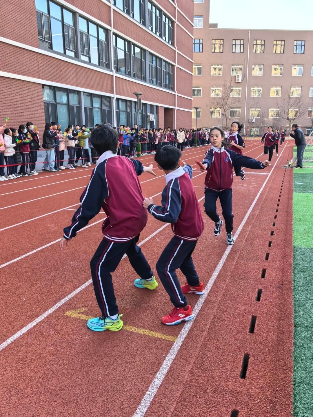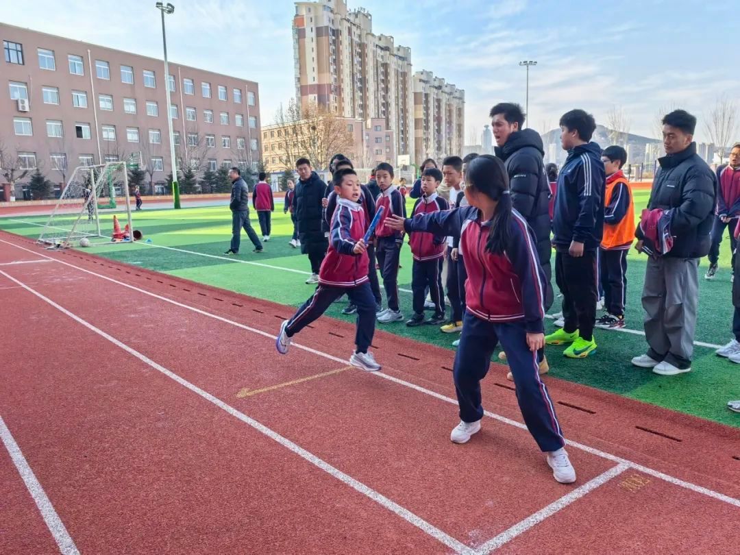 赛场上,凛冽寒风难挡青春热血。发令枪响,首棒选手似猎豹疾行,身姿矫健,逐风之姿尽显无遗;交接瞬间,接力棒仿若希望火炬,传递着信念与力量,接棒同学迅速发力,目光如炬,无畏严寒,奋勇冲向远方。赛场旁,呐喊助威声如雷贯耳,同班同学以声援传递团结,为奔跑者续航。