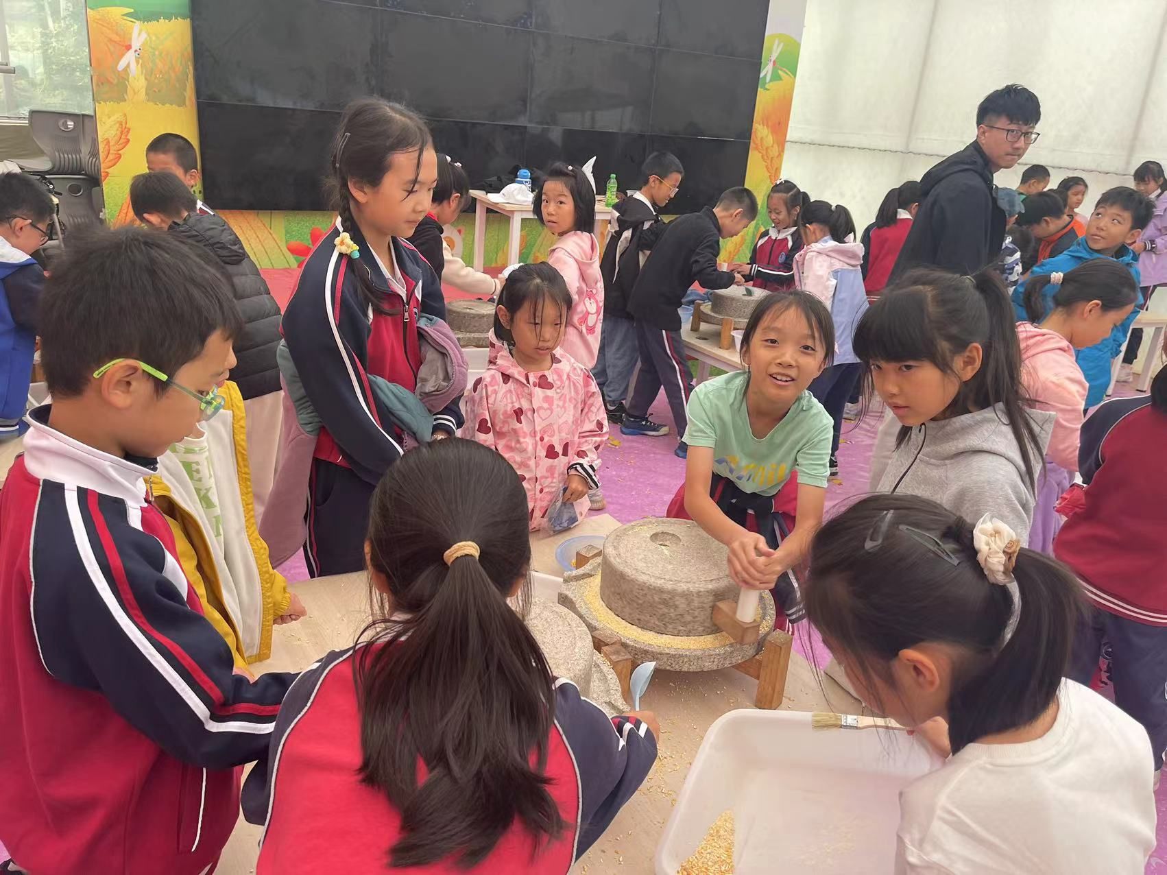 手工制作花生露活动:学生了解石磨研磨设备,初步认识石磨磨粉粉碎过程中利用的基本科学原理,了解制作花生露的要领并动手制作,培养学生细心观察、动手探索的能力。