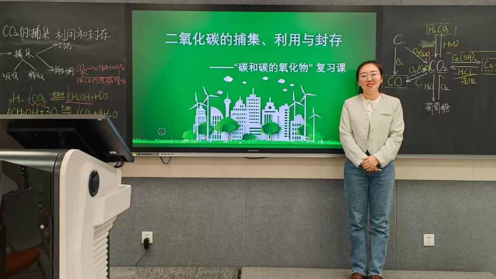 首先,本校化学教师杜琳进行了题目为《二氧化碳的捕集、利用与封存》的课堂展示。杜琳老师通过情境创设引导学生认识到“CCUS”技术的核心,即“二氧化碳的捕集、利用与封存”,并以此为目标主线,创设拟真的情境任务,采取自主、合作、探究的教学方式,将单元知识系统化、结构化,有效促进学生迁移、运用学科知识解决实际问题的能力的提升,在体验一个完整的学习实践的同时,激发了学生强烈的社会责任感和主人翁精神。