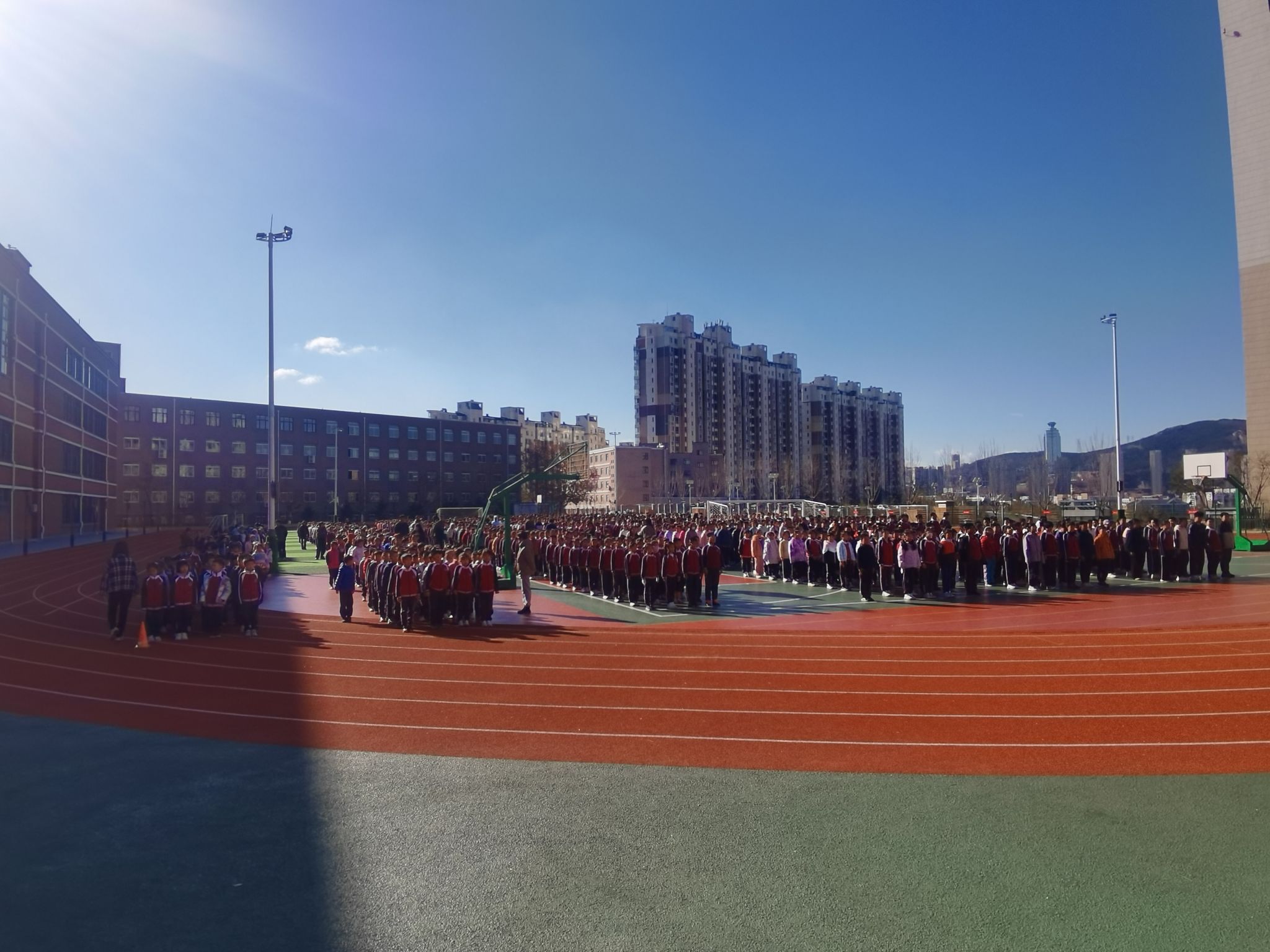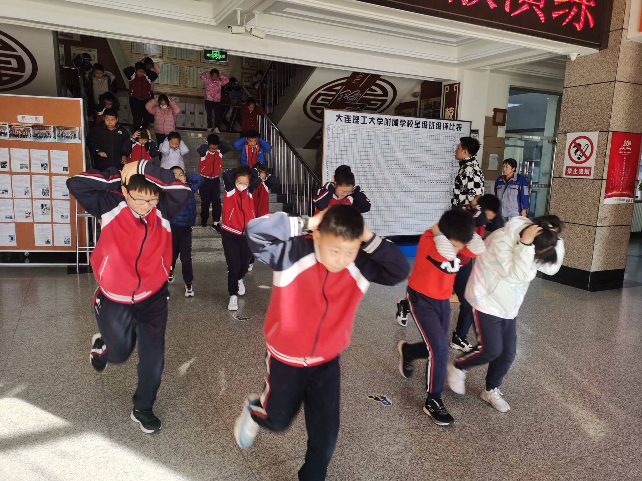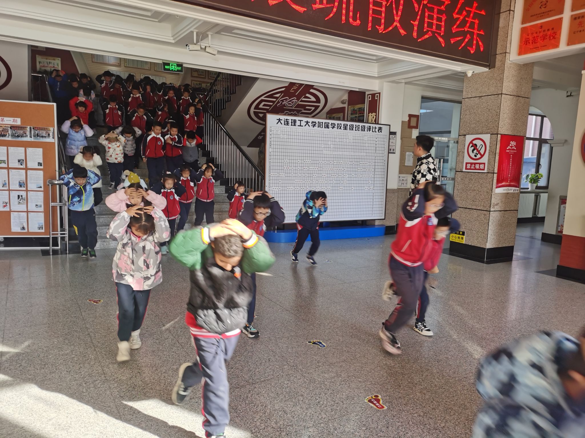 同学们在整个撤离过程中严肃、认真、有序、快速。撤离教学楼后快速到达操场,按各班级按指定位置集合站好,快速清点人数。