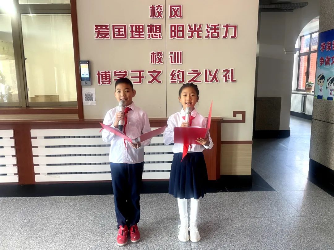 升旗仪式上,主持人李嘉祺、曹桐源两位同学倡议同学们要牢记少年先锋队几十年的风雨历程,传承红色基因。献词人董家悦、李泓霖两位同学希望同学们谨遵习近平总书记的教导,不仅要做实现第一个百年奋斗目标的经历者、见证者,更要为成为实现第二个百年奋斗目标、建设社会主义现代化强国的生力军而努力学习,时刻准备着。
