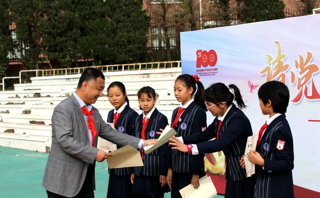 接下来由我校党委书记田晓明,副校长赵欣欣、赵霞、李桂玲为荣获“2020年度优秀少先队干部”荣誉称号和荣获区级“红领巾奖章二星章”的少先队员们颁奖。每一位获奖者的脸上都洋溢着喜悦而自豪的微笑,在光荣的队旗下昂首挺胸。