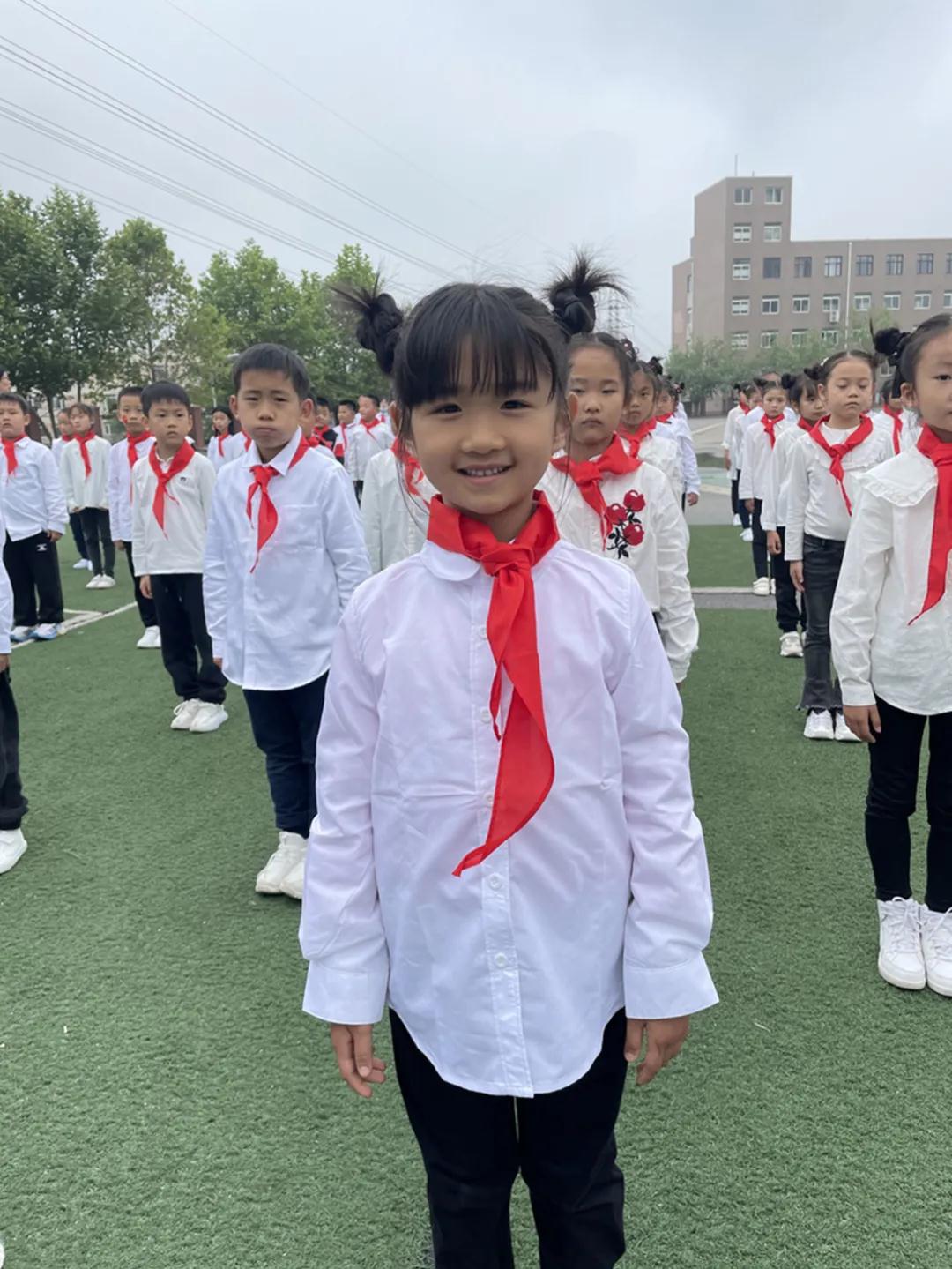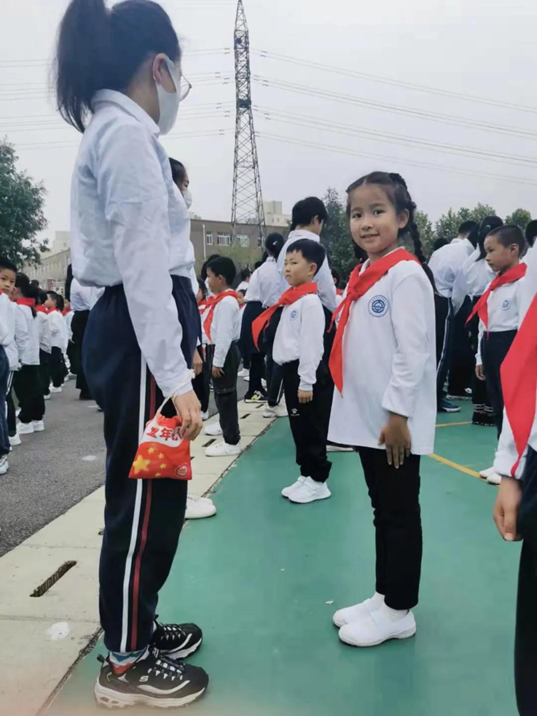 仪式第六项为聘任一年级班主任为中队辅导员,优秀队员为中队辅导员老师们带上红领巾,大队辅导员张老师授中队旗。
