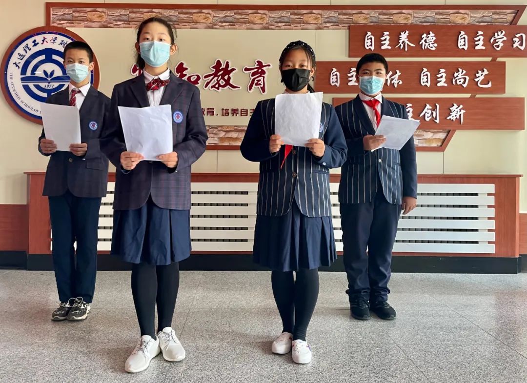 随后,董家悦、陈琦豪、常先童、吴少卿四位同学进行国旗下献词,他们提出返校虽经历了波折,但却有身边的人不断带来温暖,从校长东哥的温情尺素到各学科老师的高效课堂,从四月天迎春诗会到丰富多彩的校园云活动,从居家以来父母的精心照顾到保洁阿姨擦拭的明亮教室,是无数守护者们用他们最真诚、最温暖的方式在关爱着学子们。最后,他们强调还要感谢线上学习期间自律的自己,从“他律”到“自律”是一个人成长的标志,这必定会收益终身。