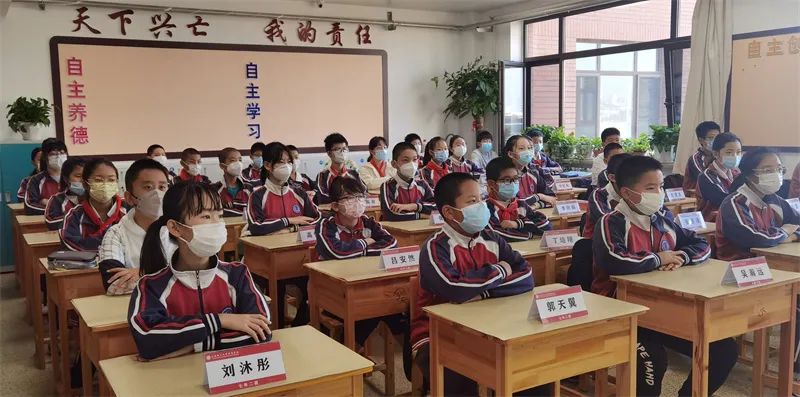 随后,彭子洛、顾海宇两位同学作国旗下献词。他们以“新新的校园,长高的你,大家一起来努力”为题,表达了返校复学的喜悦,他们谈到喜悦之心来自于见到了亲爱的老师和同学,来自于校园的新变化,来自于线上的学习同学们都有了新的收获,更来自于进入到了新的年级可以有新的目标和规划。随后,他们向同学们发出倡议,建议大家从尊敬师长,勤学自律,管好自己的一平方米,遵守防疫规定等四个方面对自己做出承诺,并严格要求自己,以崭新的精神面貌投入到新阶段的学习生活中去,做更好的自己。
