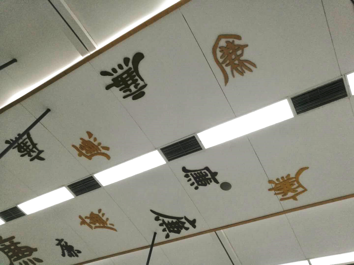 移步换景,抬头仰望,由我市书法家书写的100个“廉”字立体展示在穹顶之上。寓意头顶“廉”字,时刻不忘清白做人,干净做事。