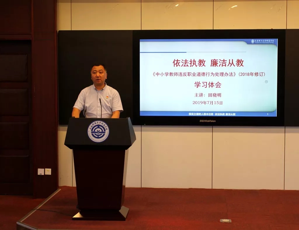 7月17日上午10点整,在我校二楼多功能厅,校党总支书记田晓明给全校教师做“依法执教、廉洁从教”专题讲座。