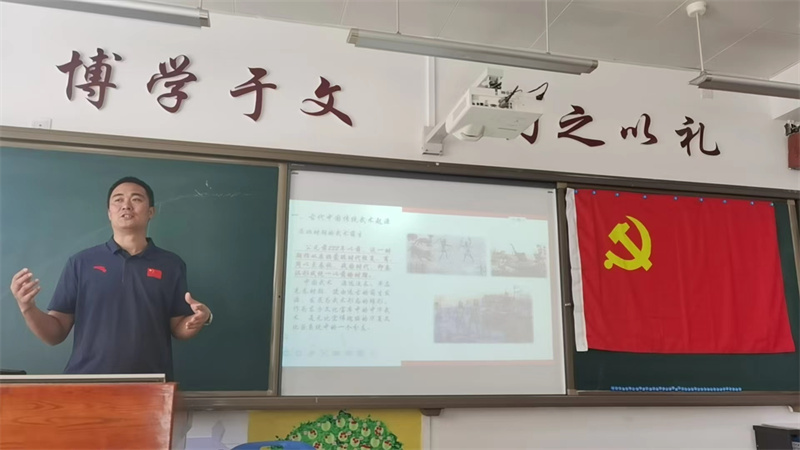 最后,运动训练党支部书记杨雨龙老师带来党课《中国传统武术起源与发展》,并带领与会成员练习《易筋经气功》。